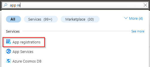 4. Navigate back into the Azure portal. In the correct subscription, search for 'App Registrations' and click on it to open the blade: