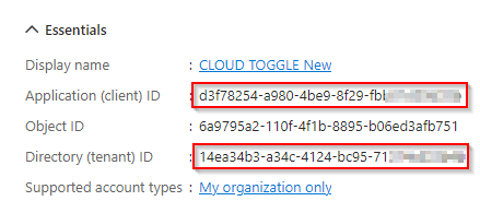 Copy the Directory (tenant) ID and paste it into the Directory (tenant) ID box in CLOUD TOGGLE.