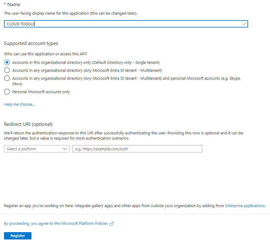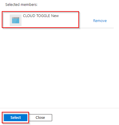 Search for and select the CLOUD TOGGLE app registration created in the previous step (Step 4) above.