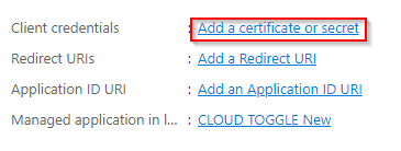 5. In the Azure portal, in the App registration blade for your new app registration just created, Add a certificate or secret.