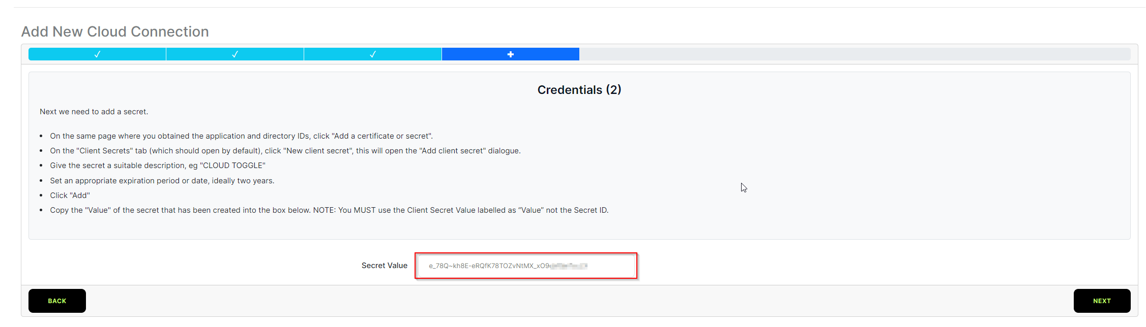 NOTE: Ensure that the VALUE is copied, and not the Secret ID.