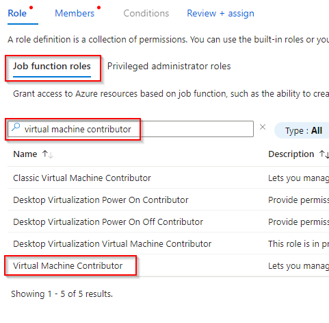 In the Job function roles tab (selected by default), search for 'virtual machine contributor'. Click on the Virtual Machine Contributor role.