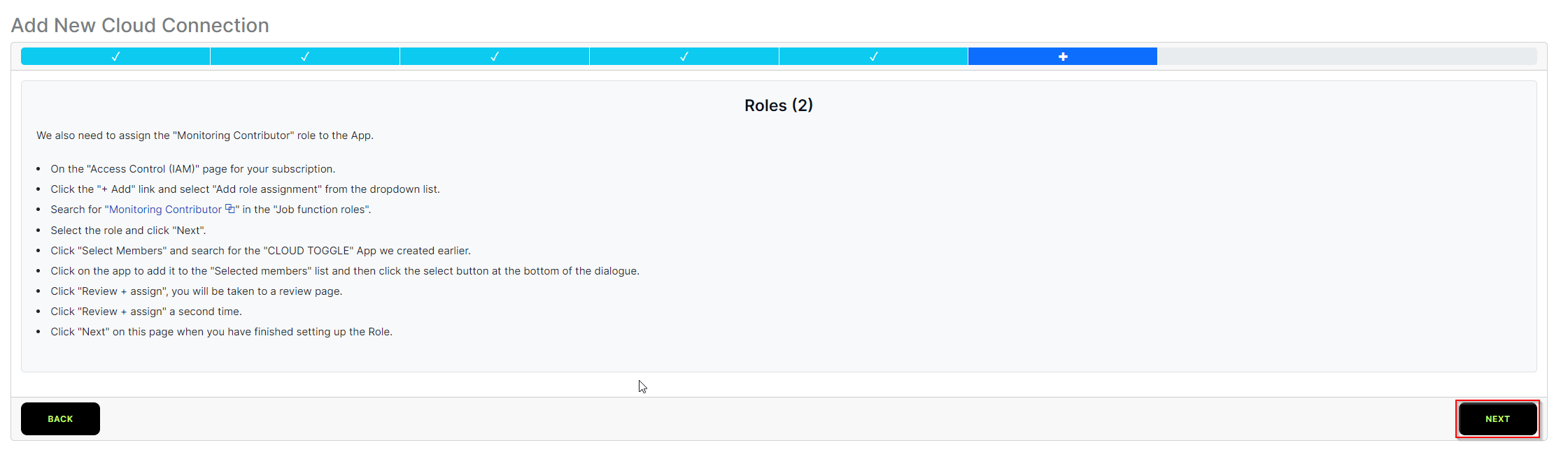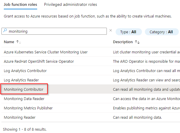 7. Repeat the process in step 6 above, adding the Monitoring Contributor role for the app registration.