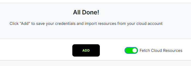 9. On the final screen click on ADD button to add the cloud connection. There is a toggle (set to on by default) which will fetch and add your cloud resources automatically. Turn this off if you plan to add your resources later on. Leaving it set to on will add all the supported resources in the Azure subscription.